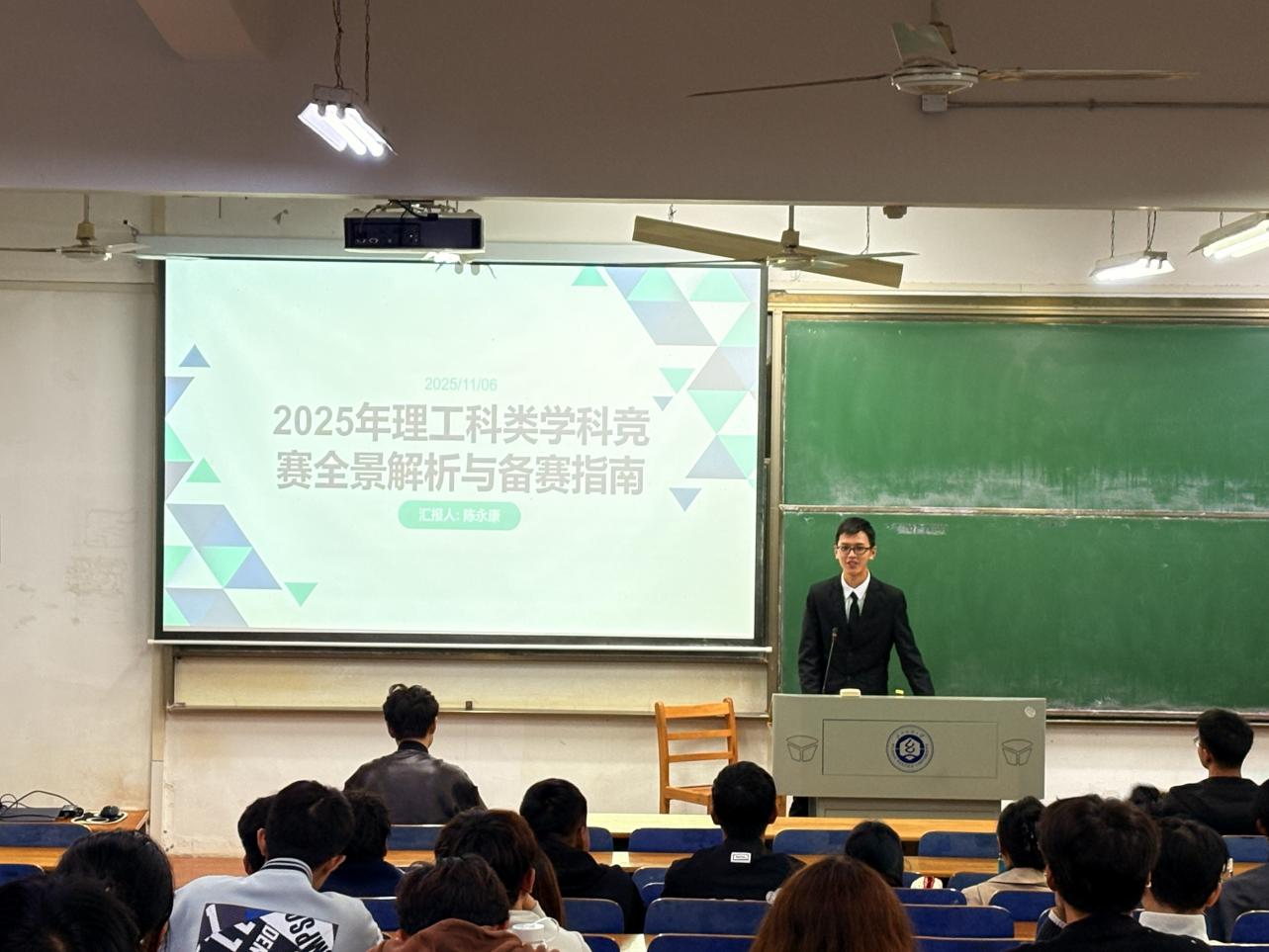 会上,陈永康同学结合自身参赛经历与丰富经验,围绕理工类各类赛事的赛项设置、竞赛内容、参赛要点、备赛技巧及项目打磨等核心内容展开详细讲解,从选题方向、团队协作到作品优化,层层递进地为同学们拆解备赛关键环节。针对全国大学生电子设计竞赛等赛事,学长重点分析了赛事特色与评审标准,并通过实际案例分享,帮助同学们理清参赛思路,掌握创新创业类项目核心竞争力的打造方法,为有参赛意愿的同学提供了极具价值的参考。