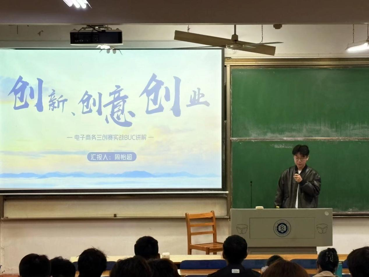 周怡超同学重点聚焦三创赛BUC(商业与创业类)赛道展开深度解读。他结合自身参赛经历与实战经验,从赛事规则解读、选题方向把握、团队组建技巧、商业计划书撰写及路演答辩注意事项等关键维度切入,用通俗易懂的语言拆解复杂赛事逻辑,针对同学们普遍存在的困惑进行细致解答。他强调,三创赛的核心在于“创新、创意、创业”的深度融合,鼓励同学们立足专业特色,挖掘真实需求,将创意想法转化为具备可行性的实践方案。现场氛围热烈,同学们认真记录要点、积极互动提问,纷纷表示此次讲解干货满满,为后续备赛提供了清晰思路与有力指导。