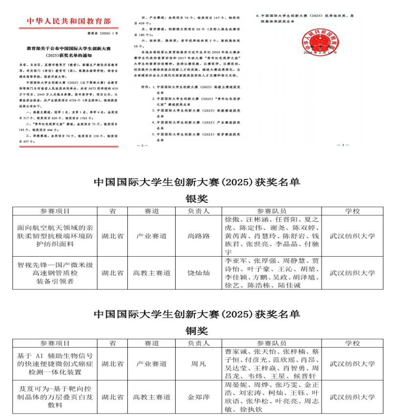 本次大赛自2025年4月启动以来,吸引了全球161个国家和地区的5673所高校参与,报名项目达619万个,参赛总人数超2443万人次,赛事竞争激烈、含金量十足,为青年学子搭建了展示创新才华、对接产业需求的顶级平台。历经国赛网评、现场答辩等多轮考验,我校项目《智视先锋-国产微米级高速钢管质检装备引领者》、《面向航空航天领域的亲肤柔韧型抗极端环境防护纺织面料》荣获全国银奖,《一针快检-基于纺织材料微纳加工的肿瘤探针及检测系统》、《芨芨可为-基于靶向控制晶体的万层叠页白芨敷料》荣获全国铜奖。